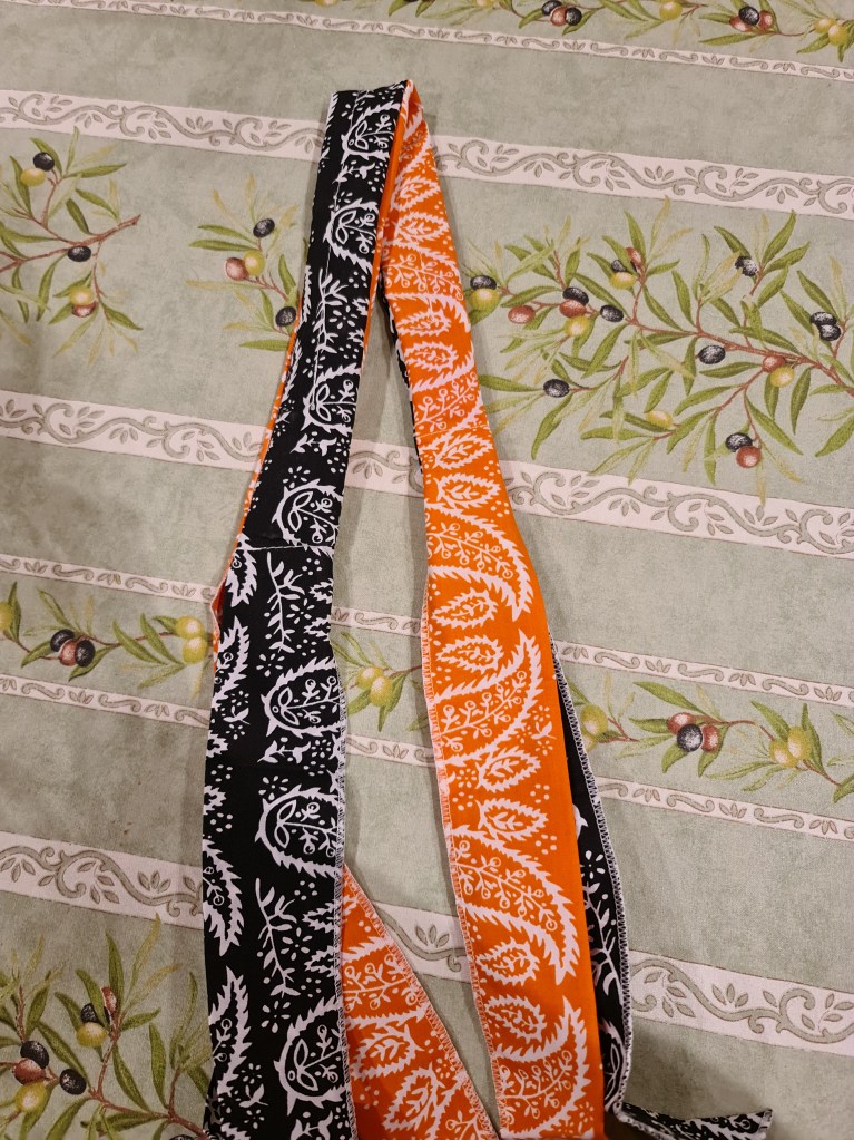 Lay one on top of the other. For symmetry, I have put the seam of one (the white stitching on the edge) to the non-seam side of the other.