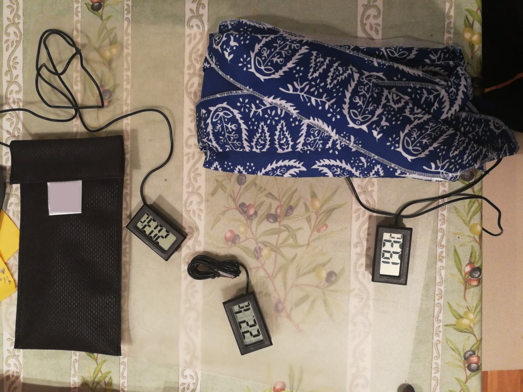 Here you see three temperature gauges measuring (in Celsius) the temperature in my house (the middle one), the temperature of a commercial pouch (on the left) and my one (on the right). Even inside, both pouches shaved off 2-3 degrees Celsius (4-6 degrees Fahrenheit). The effect becomes even stronger in direct sunlight where I have seen temperature differences of 10 degrees Celsius (20 degrees Fahrenheit) between the ambient temperature and the pouch.