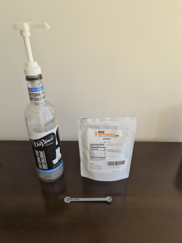 While I originally used Splenda to make the sugar syrup, when it became difficult to buy in bulk from my local supermarket, I went online and found I could buy pure sucralose. This also eliminated the dextrose/maltodextrin sugar spike issue. This is the packet I bought on Amazon.