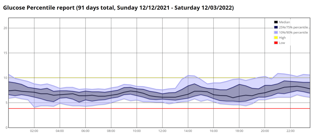 I am pretty happy with this. Using the conventional TIR range (3.8-10/70-180) I am 93% in range. Given I have not been particularly strict over the last three months, I am good with this. My predicted HbA1c is 6.0% which is creeping up but, given my pancreas is slowly being destroyed by my immune system, this is not overly surprising. Hopefully the blood tests will reflect a similar HbA1c when I get the results back.