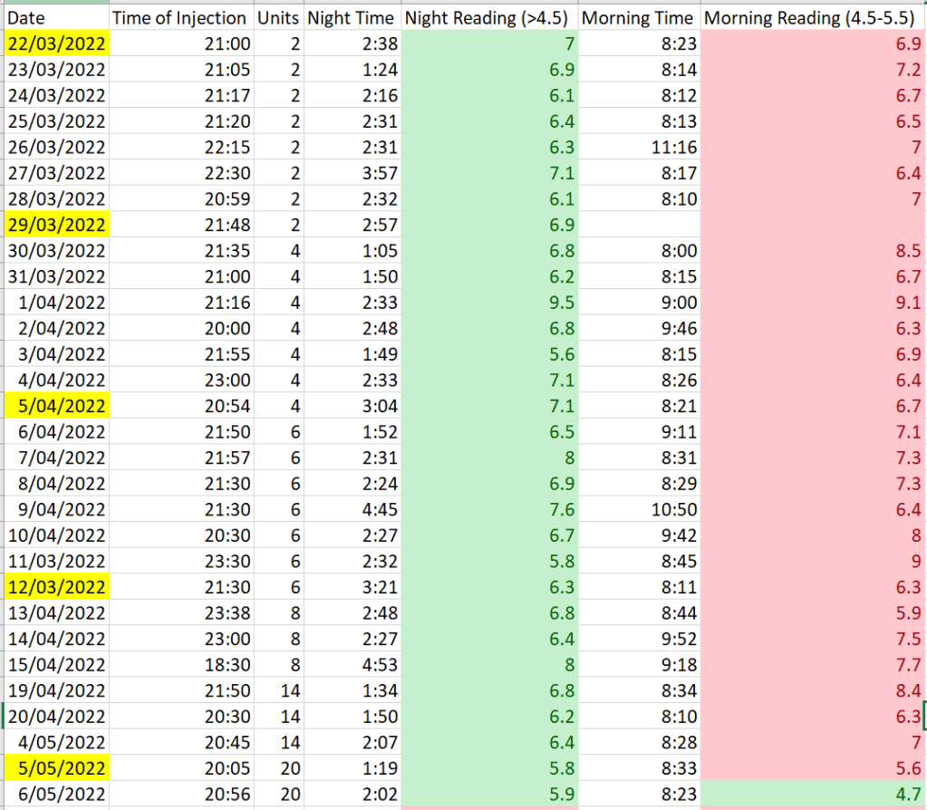 Being a Type 1 LADA my progression to full insulin dependence is quite slow (5 years since diagnosis and still only using insulin overnight). For now, I just need to inject long acting insulin after dinner to keep my night-time levels low and to counter Dawn Phenomenon. However, I often cannot remember if I have done it or not. Not wanting to give myself a double-dose, it would be great if I can digitally record when I give myself the injection and when.