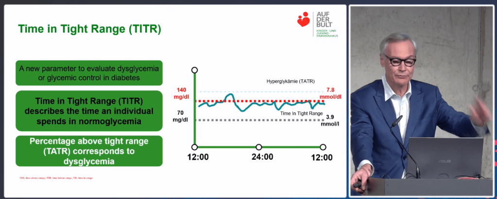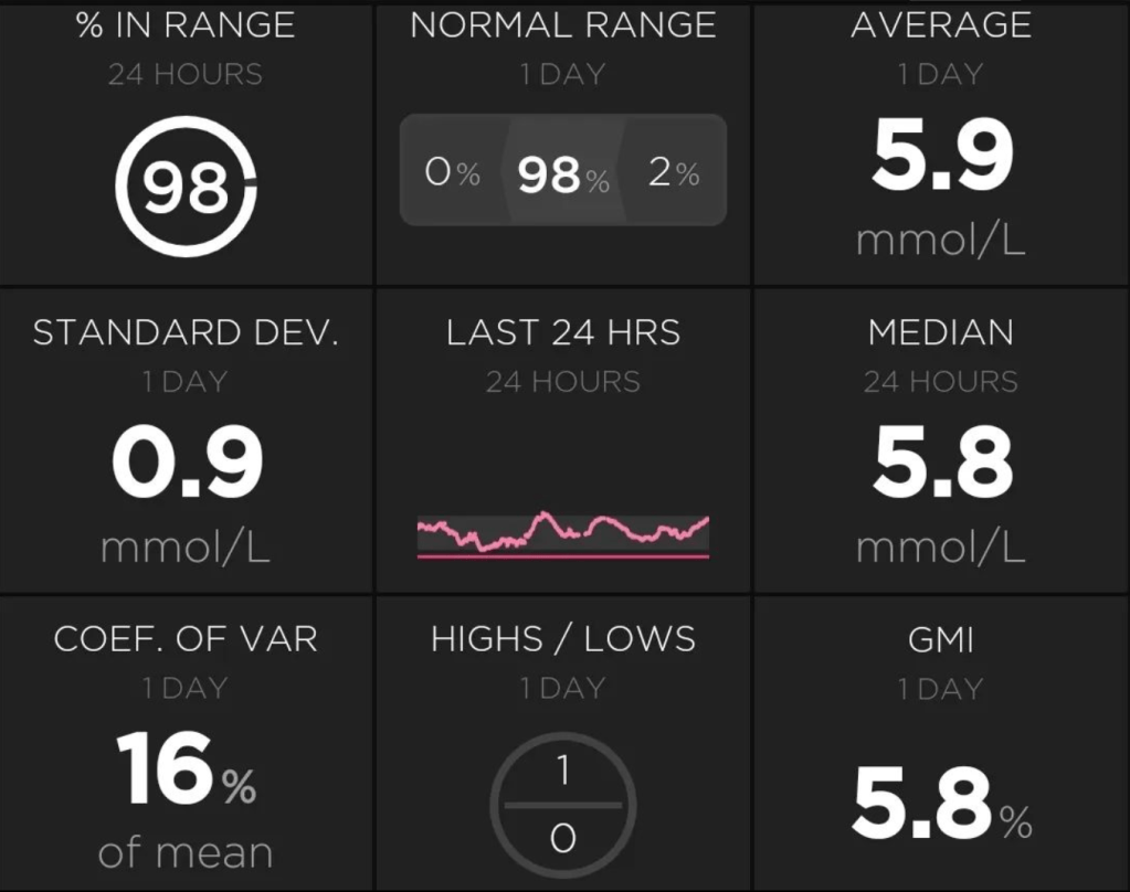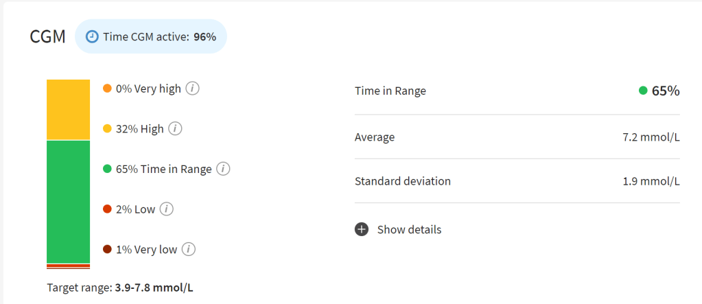 - Time in Tight Range (3.9 – 7.8 mmol/L aka 70 – 140 mg/dL): 65%