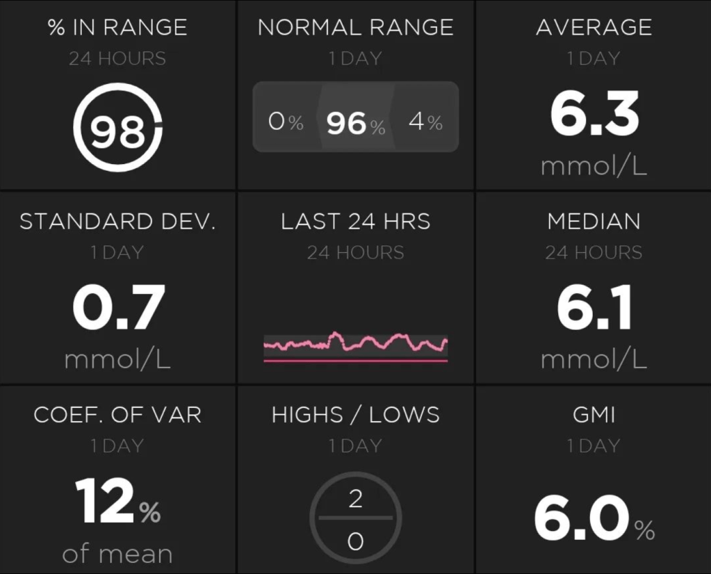 The only measure I did not consistently hit was Mean Glucose on days two and three due to my morning coffee throwing out my values. By day four I had adjusted the coffee not to spike me so I think it is fair to say that, with improved experience managing the snacks and setting my pump to a more aggressive target (it was set to 5.4 mmol/L aka 98 mg/dL for the experiment but can be set as low as 4.4 mmol/L aka 80 mg/dL), given I had zero lows during the four days, it would not be hard to consistently hit this range as well.