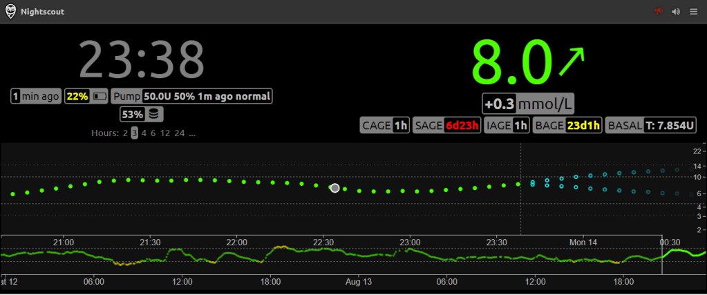 Here, for example, I can see the CGM trace for the last 24 hours, how much insulin my pump has left (>50U), the charge level of my phone (22%), how old my pump cannula and insulin is (1 hour), how old my sensor is (6 days 23 hours), the age of my pump battery (23 days 1 hour) and my current basal rate (7.854 units/hour).