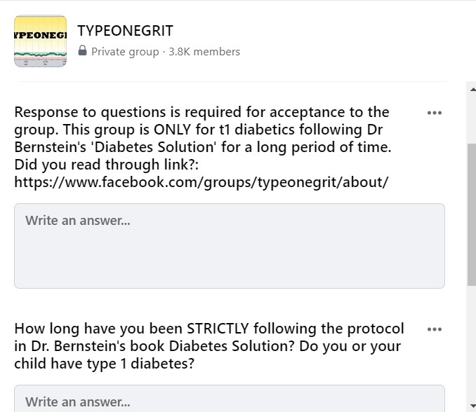The second commonality is the groups studied were not necessarily a random sample. In the case of the first paper, it is simply not stated where the participants came from; all we know is they were on a ketogenic diet for a number of years. In the case of the second, they came from a group dedicated to strictly following Dr. Bernstein’s approach. To join the group, participants have to pledge they follow Bernstein to the letter and have done for a “long period of time”. Here is an image of the application form to join the group.