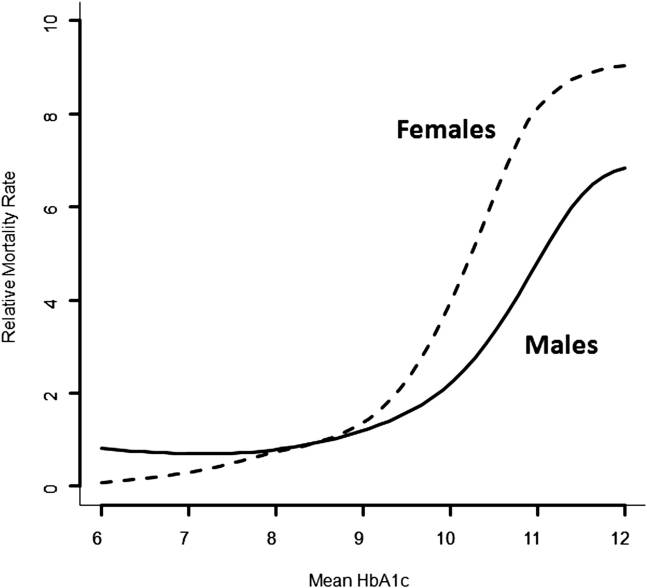For males, while still quite flat, the mortality rate actually increased below 7% and started to be higher than the general population around 6%. This was not the case for women where an HbA1c continued to drop as the HbA1c went lower and become effectively unmeasurable at 6%.