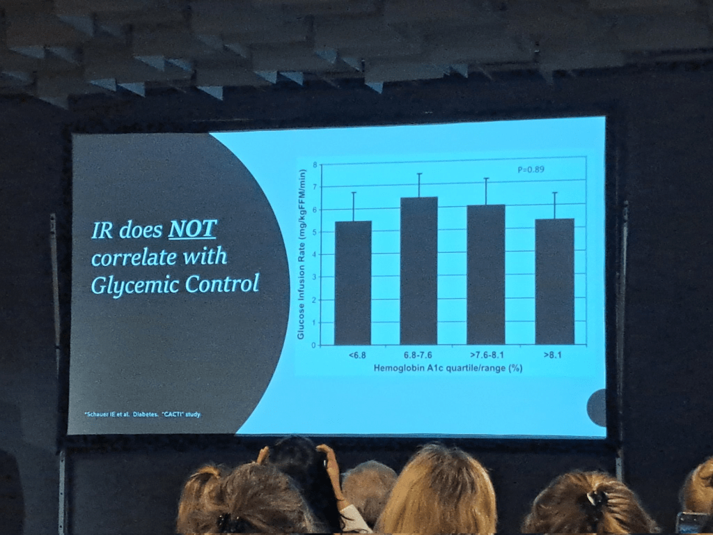 Rendering the term “double diabetes” somewhat redundant, it was shown that people with type 1 diabetes also have insulin resistance which, in their case, is driven by the insulin they inject and is independent of factors such as weight or glycemic control. Low carb was mentioned as one lever to pull in managing it.
