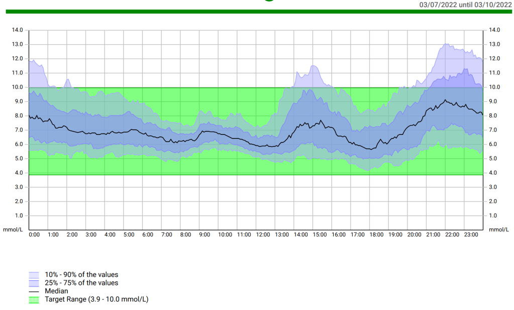 A criticism sometimes made of AIDs, especially in the Commercial systems, are their high blood glucose targets (the Tandem, for example, does not allow for a target below 6.1mmol/L (110mg/dL)). The truth is not all AIDs are equal. Broadly speaking the Open Source systems allow for a more aggressive target than the Commercial systems but the system with the lowest possible target is the CamAPS system whose target can be made to go as low as 4.4mmol/L (80mg/dL) although I generally set mine to 5.5mmol/L (99mg/dL) as this is the average resting glucose of a person without diabetes.